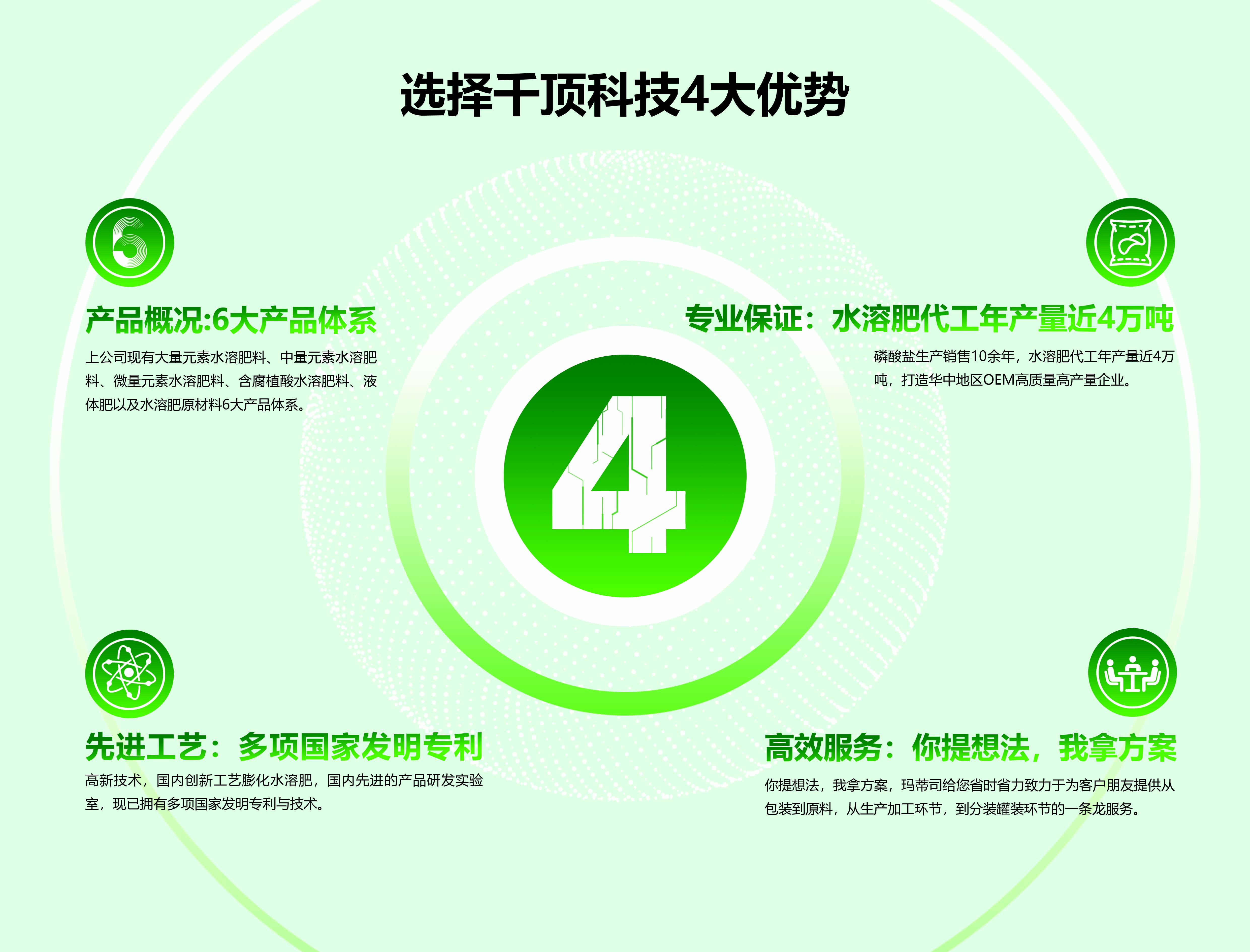 湖北千頂科技有限公司位于九省通衢,美麗的江城武漢,是一家專業(yè)從事研發(fā)、生產、磷酸鹽和高端水溶肥等一體化工企業(yè),是一家致力于打造農業(yè)與工業(yè)攜手進步的化工企業(yè)...